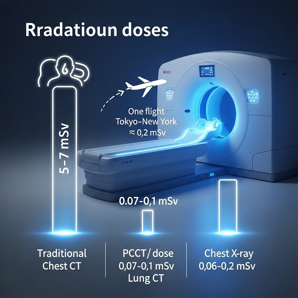 - PCCT low-dose (lung cancer screening): ~0.07–0.1 mSv